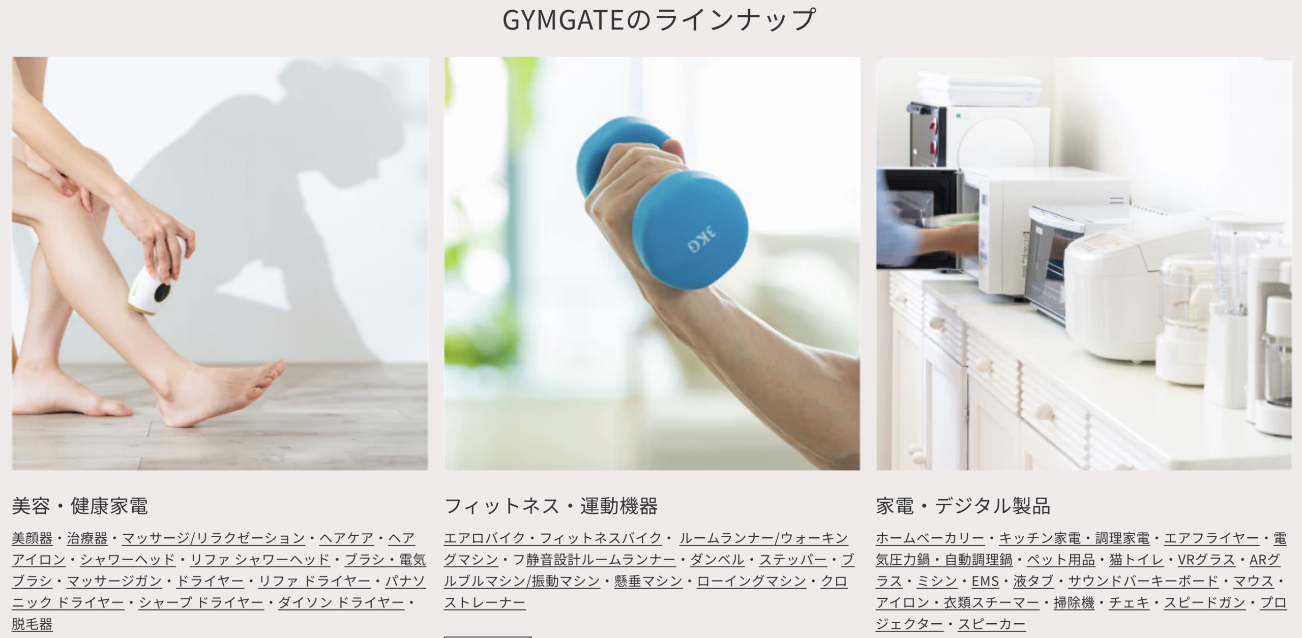 ジムゲートは、トレーニング器具や家電、ビューティー機器などを月額や短期レンタルで提供するサービスです。