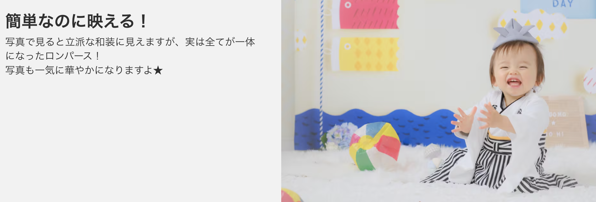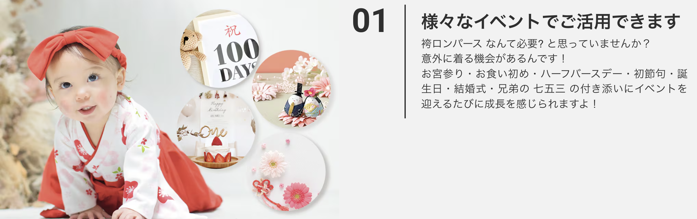 また、ひな祭りや端午の節句といった年中行事、スタジオ写真・年賀状用の家族写真など幅広い場面で使い回せるコスパの高さも魅力。